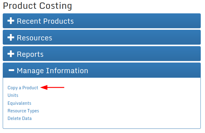 To copy a product, go to the costing system and click the Manage Information tab. Then click Copy a Product.