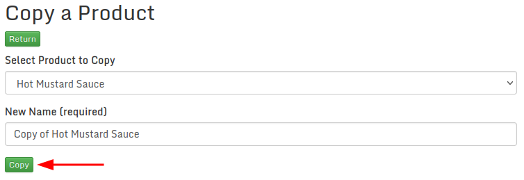 Copying a product will create an exact duplicate of the product you select and let you give it a different name. This will save you time entering information about a product that is nearly the same as another product. By copying it, you can make a copy of one product with a new name and then change the things that are different.