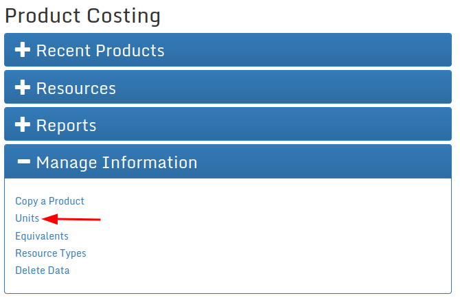 To rename a unit, go to the costing system and click the Manage Information tab. Then click Units.